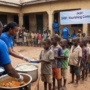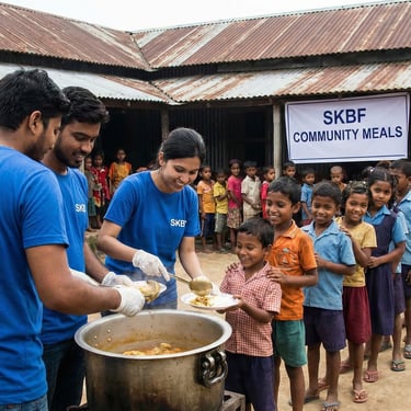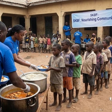 Mission Log: Operation Nourish. This image below illustrates the sheer logistical coordination of SKBF’s volunteer corps. We see a team of volunteers who have set up a temporary distribution station in the heart of the village. The focus here is on efficiency and care: volunteers are organized in an assembly line, with some managing the crowd flow to ensure safety, while others are tasked with portioning out nutrient-dense stews from large communal pots. It highlights that SKBF volunteer work isn't just about showing up; it's about executing a structured relief operation that ensures every child leaves with a full belly and a sense of dignity."